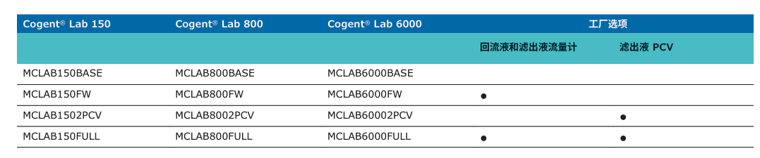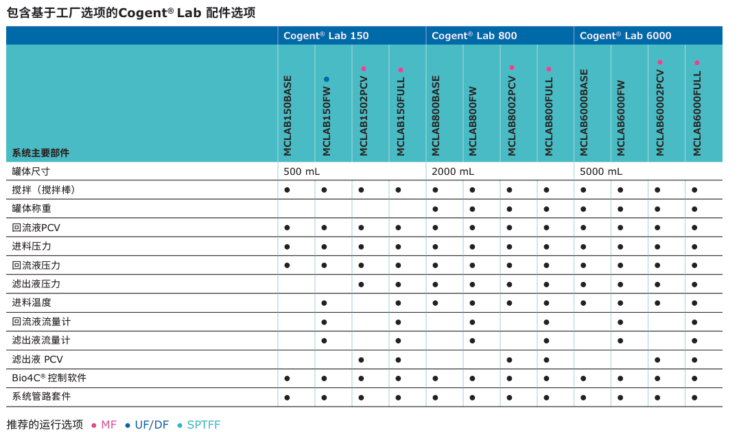 Cogent® Lab 系统:Cogent® Lab 产品家族使用与生产规模设备相似的设计、传感技术和配件。 拥有相同的设计和20-6000ml/min的流量范围,Cogent® Lab系统专门为 简化工艺开发而设计。这一系列系统提供线性和统一直观的软件体验,减少培 训要求并确保工艺流畅地放大和缩小。 Cogent® Lab150、800 和 6000 系统针对高产品回收率和排空性能进行了 优化,确保小规模TFF成功操作。凭借在浓缩\渗滤、微滤和单向切向流过滤 (SPTFF) 模式下运行的能力,我们的系统可以适应广泛的运行参数(体积、温 度、流量), 提高灵活性并减少资本支出。虽然基本配置可以满足大多数工艺 开发的必要条件,但模块化能够实现系统根据特定要求进行定制。