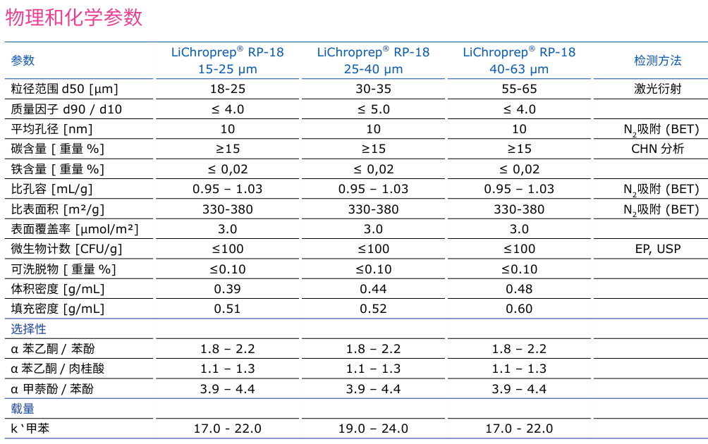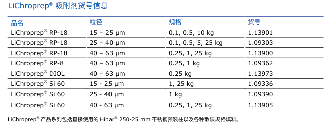 LiChroprep® 硅胶吸附剂,具有多孔性和不规则的特点,严格分为 15-25 μ m、 25-40 μm 和 40-63 μm 粒径范围,表现了良好的分离性能和足够的稳 定性,且拥有非常高的性价比。