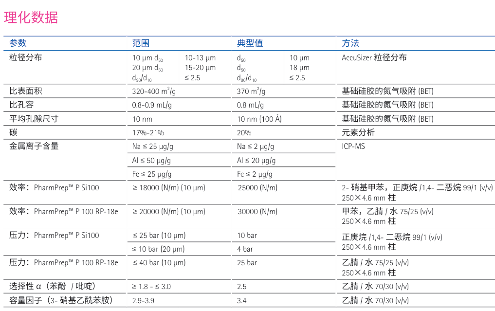 制备型液相层析 (LC) 的PharmPrep™ P 吸附剂是球形、多孔的硅胶载体,基质为均匀、同质的硅胶,粒径分布窄,使填料拥有高性能和高填充稳定性 ,可再现的比表面积和孔隙尺寸分布 ,机械稳定性提高 ,制造质量高,再现性好。有两种粒径: 10 μm 和20 μm。这些新型吸附剂的孔径为100 Å (10 nm),非常适合用于短肽(如胰岛素)和其他 生物制药、制药API(如抗生素和荷尔蒙)的纯化步骤。