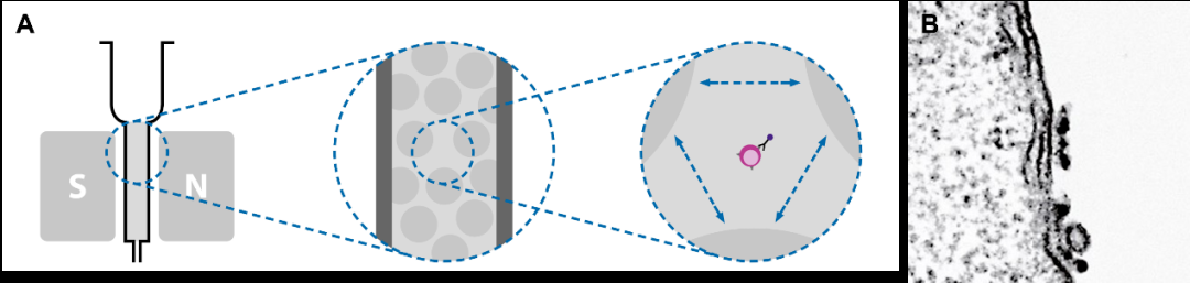 图1 MACS技术一览,(A) MACS分选柱示意图,(B)透射电镜下的MACS磁珠。