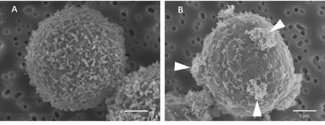 图2 磁分选的CD3细胞的扫描电镜图像,(A)为MACS技术分离的细胞,没有明显标记或外观改变,(B)是用其他品牌纳米级磁珠和无柱式技术分离的细胞,箭头指示过度标记。