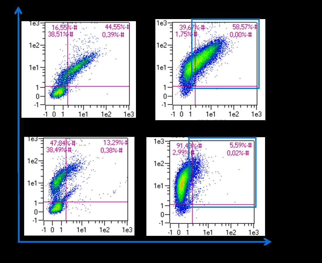 图3 使用CD3流抗染色后流式检测阳性选择的人CD3 细胞,MACS技术分选的细胞很容易用流式检测,而无柱式系统分选的细胞无法用流式检测,因为大量的磁珠标记导致流抗染色的封闭效应。