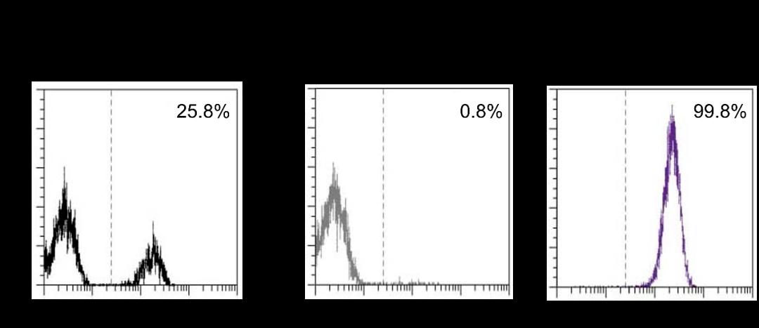 图4 使用人CD14 MicroBeads从PBMC中分离单核细胞,流式检测分选前和分选后样本中的CD14阳性细胞占比,分选后阳性组分纯度达到99.8%,阴性组分只有0.8%。