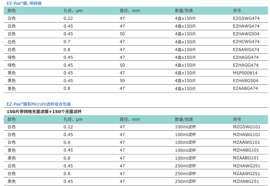 每张膜片外包装上都印有货号、批次号、孔径和序列号(从150到1)