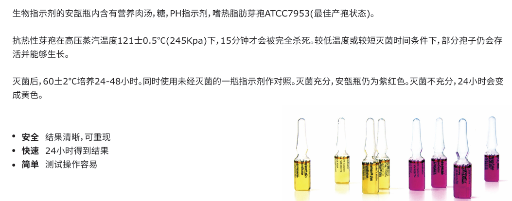 Sterikon® plus 生物指示剂,每支安瓿中含肉汤、糖、pH指示剂和非致病性嗜热脂肪地芽孢杆菌( Geobacillus stearothermophilus )ATCC 7953的孢子(孢子形成优化)。在121±0.5°C(245 kPa)的压缩蒸汽中加热15分钟后,可完全杀死孢子。如加热温度较低或暴露时间较短,少量孢子可以存活,并在温育后生长。将Sterikon安瓿® 与需要高压灭菌的批次一起放入高压灭菌器。灭菌过程的效果通过温育安瓿进行检查。安瓿内容物呈红色(或紫红色),指示嗜热脂肪地芽孢杆菌( Geobacillus stearothermophilus ) 无生长,灭菌充分;如安瓿内容物呈黄色(或橙黄色)则指示该菌存在生长,灭菌不充分。