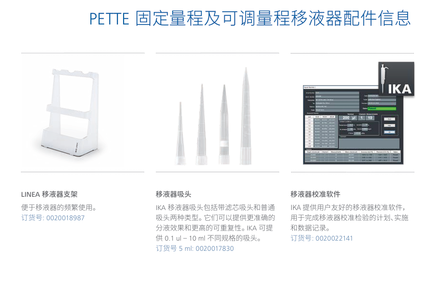 IKA 单通道固定量程和可调量程移液器具备人体工程学设计及精准可靠的特性,使 得其可以满足现代实验室多样化的应用需求。 颜色标识量程范围,易于快速选择合 适的移液器。 抗冲击、耐 UV 及化学腐蚀性、圆锥吸嘴,使得其可以长期稳定的完成 移液工作。 IKA PETTE 固定量程及可调量程移液器可以整支高压灭菌,使其消毒更 容易。 这些性能确保无故障、精准、安全的操作。