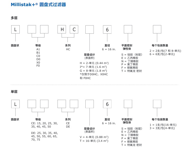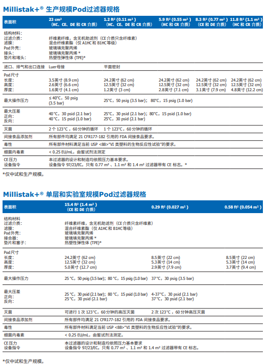 Millistak+® CE系列(纤维素,无硅藻土) 由使用纤维素的单层介质构成,适合于粗过滤应用(例如初级澄清)。 供应CE 15-50等介质等级,有16” 圆盘式和Pod形式膜包。