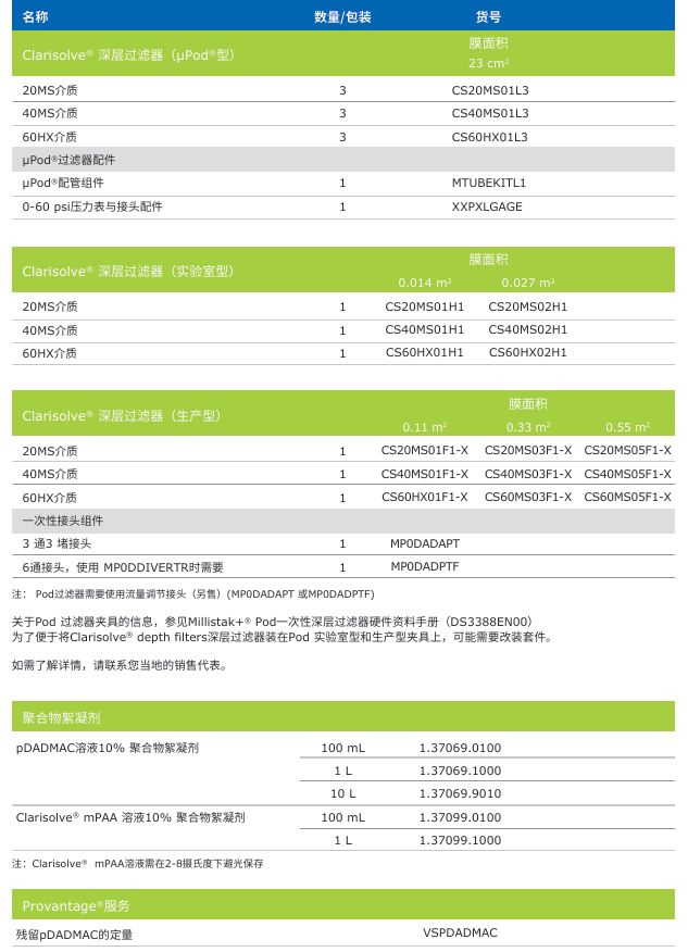 絮凝剂 聚阳离子聚合物改性的聚烯丙胺(mPAA)和聚二烯丙基二甲基氯化铵 (pDADMAC) ,是非常有效的絮凝剂,配合Clarisolve® 深层过滤器结 合使用时,对于高细胞密度料液的澄清有很好的效果。