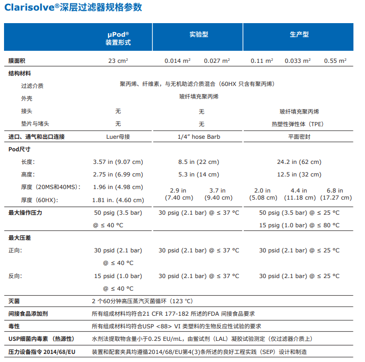 Clarisolve®深层过滤器 解决具有挑战性的高细胞密度、经过预处理的细胞收获液的澄清,相比 经典的Millistack系列,大大提升高细胞密度细胞收获液的澄清工艺载 量,且对HCP及DNA的去除更加出色。膜包孔径是根据预处理后进料 液流的粒度分布而设计的,且针对不同的预处理方法,提供三个不同的 截留孔径分布范围的深层过滤器型号。