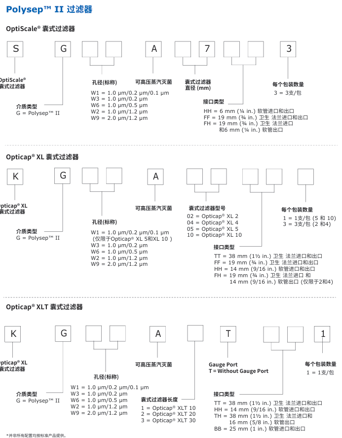 Polysep™ II过滤器兼具深层过滤器的容污能力和膜式过滤器的截留效 率,在紧凑的单个滤器中提供多级过滤,用于关键预过滤应用。孔径范 围0.1-2.0 µm。
