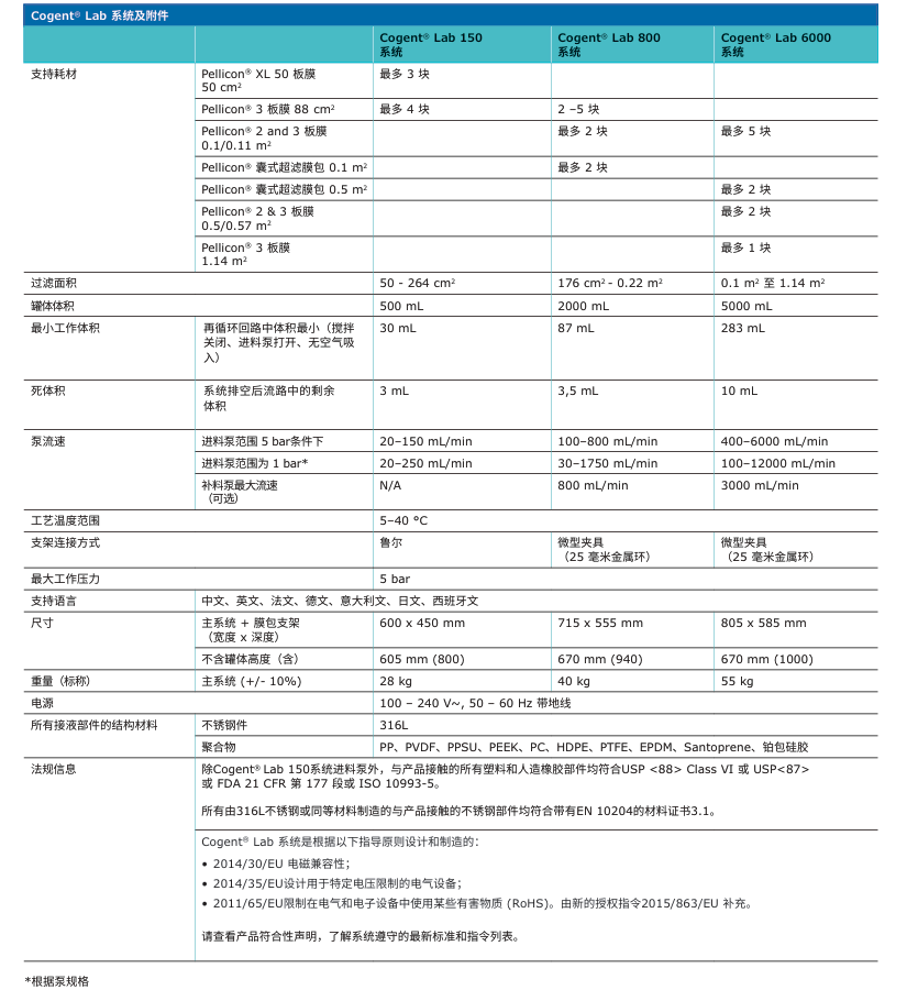 Cogent® Lab 系统:Cogent® Lab 产品家族使用与生产规模设备相似的设计、传感技术和配件。 拥有相同的设计和20-6000ml/min的流量范围,Cogent® Lab系统专门为 简化工艺开发而设计。这一系列系统提供线性和统一直观的软件体验,减少培 训要求并确保工艺流畅地放大和缩小。 Cogent® Lab150、800 和 6000 系统针对高产品回收率和排空性能进行了 优化,确保小规模TFF成功操作。凭借在浓缩\渗滤、微滤和单向切向流过滤 (SPTFF) 模式下运行的能力,我们的系统可以适应广泛的运行参数(体积、温 度、流量), 提高灵活性并减少资本支出。虽然基本配置可以满足大多数工艺 开发的必要条件,但模块化能够实现系统根据特定要求进行定制。