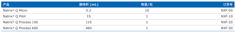 Natrix® Q 阴离子膜是一种多孔聚丙烯酰胺水凝胶,含有高密度的季铵 (Q) 侧链结合基团,由惰性纤维网物理增强。相互连接的孔结构 (标称孔径,0.4 μm)和高配体密度为蛋白质结合提供了更大的接触表面 积、高渗透性,并实现了高通量和高流速下的高载量(某些单抗载量可达到 10 kg/L),同时在这些极端操作条件下保持出色的杂质清除率。结合成熟 的 Q 配体技术,这些特性使 Natrix® 膜层析成为商业规模层析纯化的绝 佳选择。
