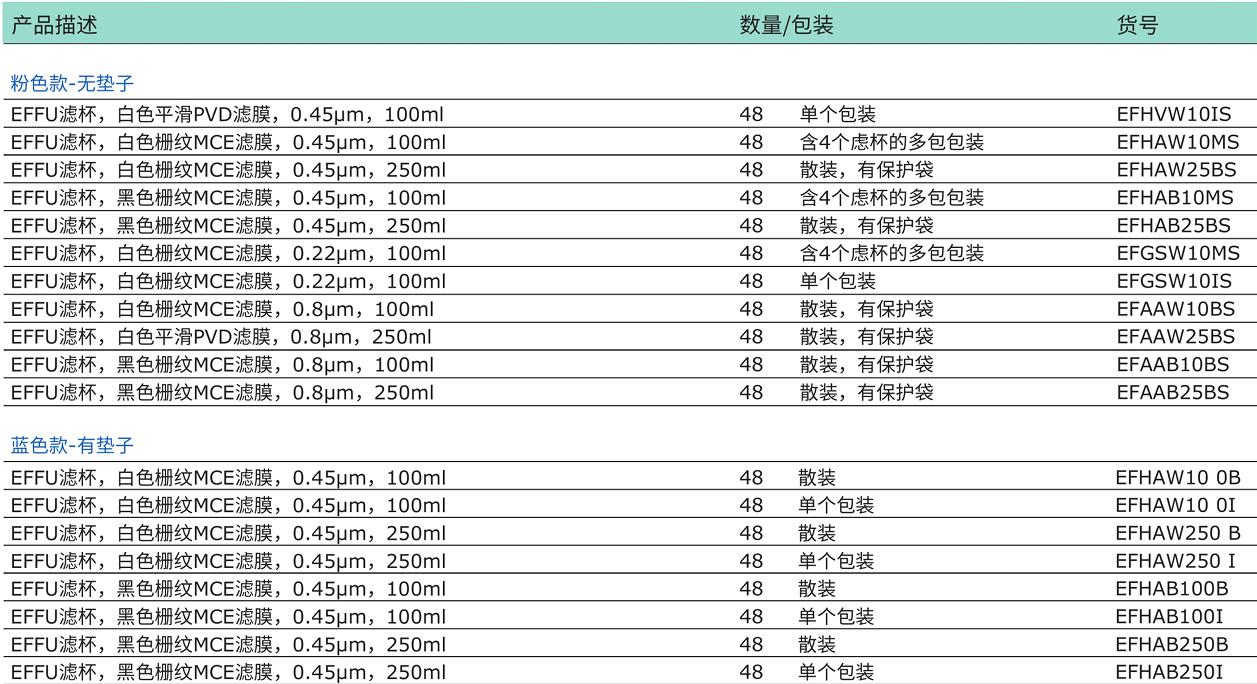 两种EFFU虑杯都有各种不同的型号以适合各种应用。