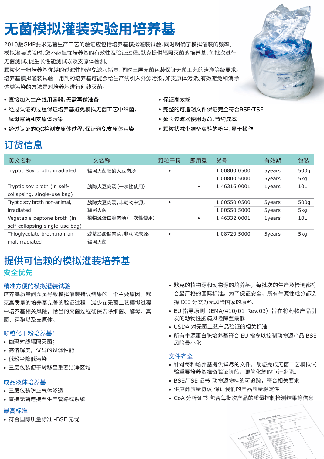 培养基灌装(又称工艺模拟)是重要的微生物试验,利用无菌培养基代替药物或饮料产品评估无菌工艺性能。制药行业培养基灌装试验采用的即用型培养基包括胰蛋白胨大豆肉汤(TSB)和植物蛋白胨肉汤(VPB)。这些液体肉汤均为无菌版,10L袋装供应,且支持定制包装袋。我们精心调配的颗粒培养基可保证制药厂家进行风险极低的高效培养基灌装试验。除即用型培养基外,我们也提供标准和无动物源的TSB培养基。我们的颗粒培养基经过辐照灭菌,并以三层袋包装,可最大限度提高培养基灌装试验的安全性。饮料瓶装生产线和碎冰机的培养基灌装试验可使用我们的林登谷物培养基。