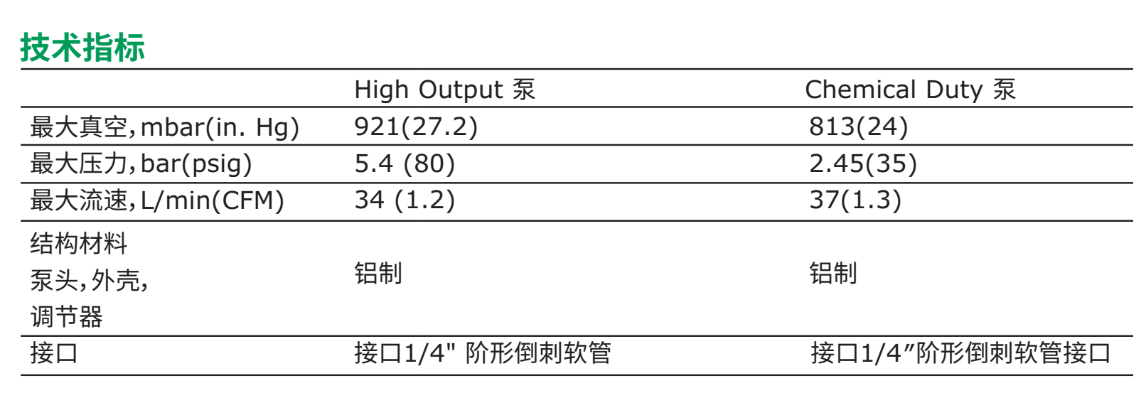 高输出泵采用活塞驱动设计,功率更高。 Chemical Duty泵配备耐化学性头和隔膜,以配合腐蚀性化合物和溶剂使用。 两种泵都包含70cm的1/4"管,一个MillexFA50过滤器,在线防水。两种泵都列入UL认证目录并标有CE字样。