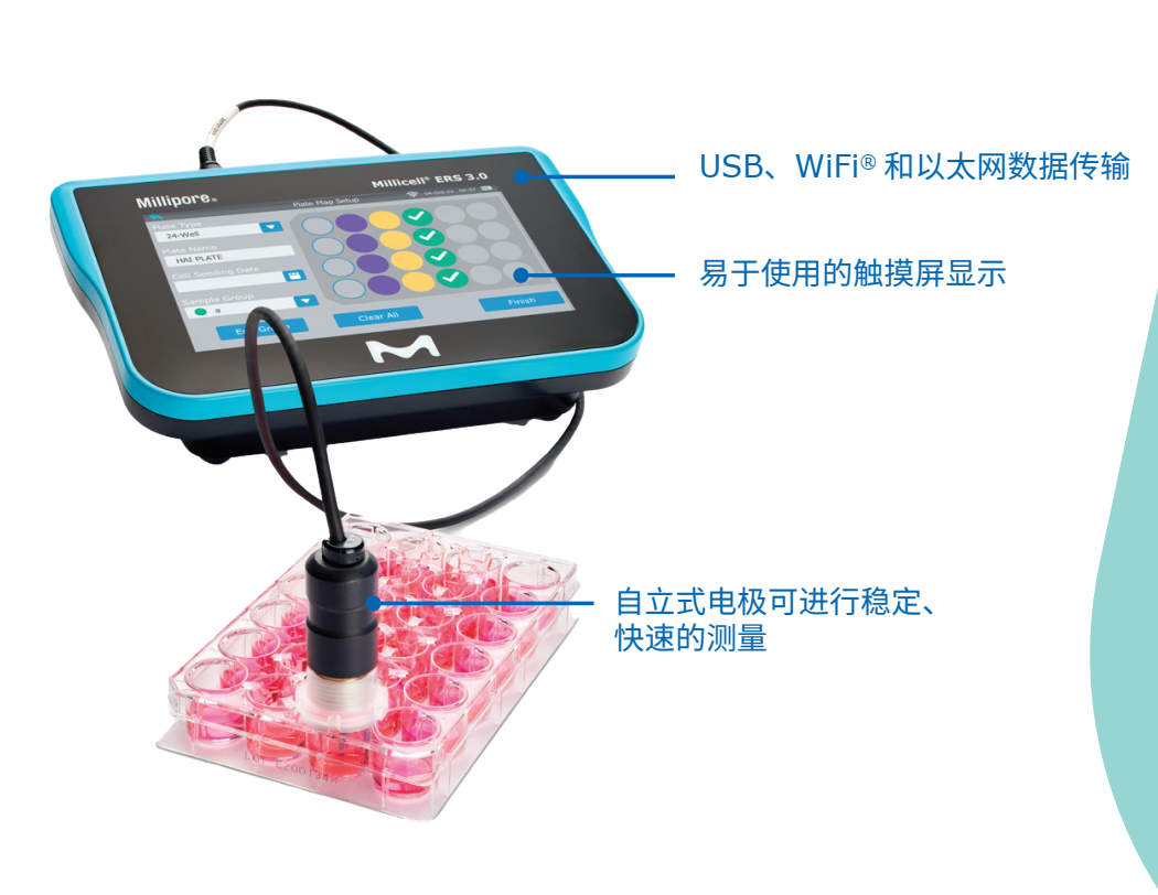 Millicell® ERS 3.0 数字化电阻仪通过直观、用户友好的增强功能简化了数据采集。使用自立式孔内电极实现更稳定的测量。实时记录仪器上的电阻和电压数据,随时跟踪结果。使用基于云的应用程序简化跨孔和实验间的分析。读数一 致,噪声低,分辨率高,准确度高 。使用Millicell® ERS 3.0 数字化电阻仪优化您的跨皮层电阻实验。