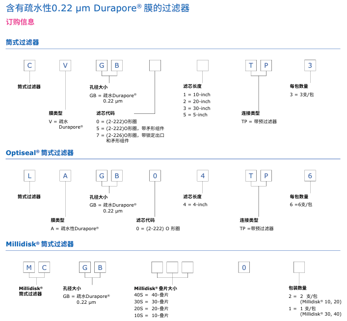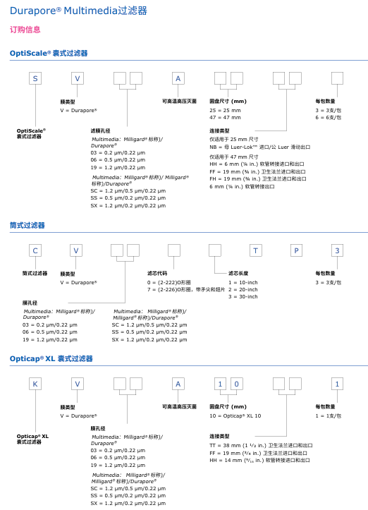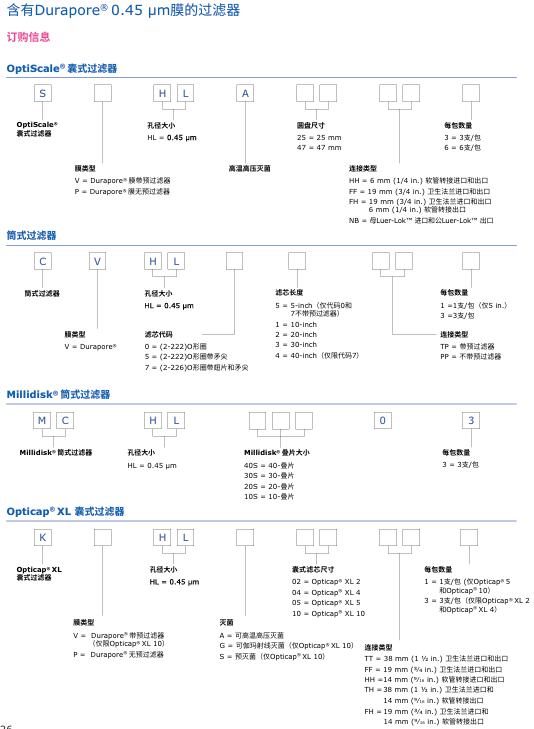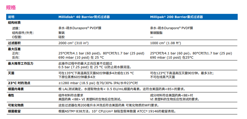 Durapore® 0.45 μm滤膜 生物负荷减少和颗粒去除过滤 器,可带或不带集成的0.5μm Milligard® 预过滤器。
